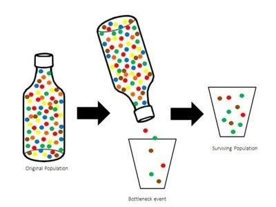 A genetic bottleneck occurs when a population is reduced to a very small subset of the original larger population, so that the last remaining individuals represent the remaining subset of the genetic heritage of the entire initial population.
