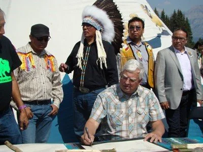 Bison Conservation Program, signs the Buffalo Treaty to create the first cross-border indigenous treaty between the United States and Canada. Photo courtesy of Harvey Locke.